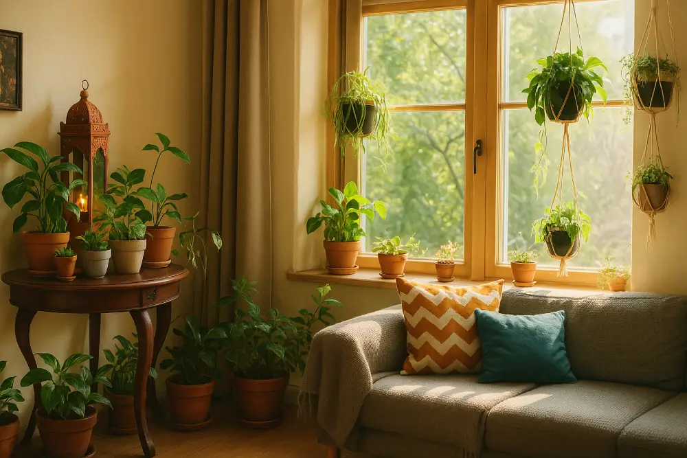 cozy-sunroom-with-indoor-plants-and-sunlight by | Bright sunroom corner with cozy seating, colorful pillows, potted plants, and hanging greenery by large sunlit windows